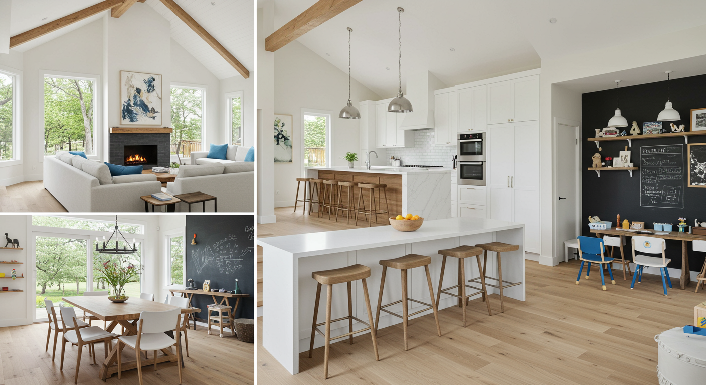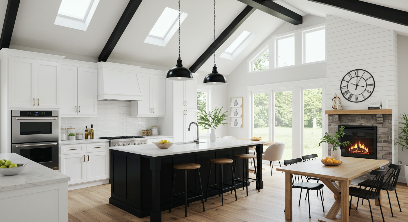 This 2019 rustic contemporary home w/Post & beam cathedral ceilings & flooded with natural light, suits any stage of life. Main floor includes a master suite, den, mudroom, laundry, ½ BA, great room, eat-in kitchen & formal dining.